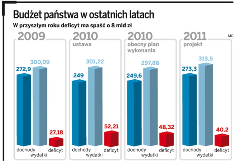 Oszczędności na konsolidacji rachunków to jedna z przyczyn zmniejszenia się potrzeb pożyczkowych rządu w 2011 roku. W projekcie budżetu zapisano, że wyniosą 56,3 mld zł wobec 79,1 mld zł w roku 2009. Potrzeby zmniejszą się również dlatego, że zmaleć ma deficyt budżetowy do 40,2 mld zł z 48,3 mld zł w tym roku. A to dzięki większym dochodom, które wyniosą w przyszłym roku 273,3 mld zł (24 mld zł więcej niż w tym roku). Rząd zmienił swoje plany co do wielkości dywidend, jakie miałyby wypłacić budżetowi spółki Skarbu Państwa: już nie spodziewa się 8,5 mld zł, ale niecałych 3,6 mld zł. Ten ubytek zostanie zrekompensowany wypłatą dochodów z BGK. Chodzi o wpływy ze sprzedaży pakietu akcji PKO, które dziś posiada państwowy bank.