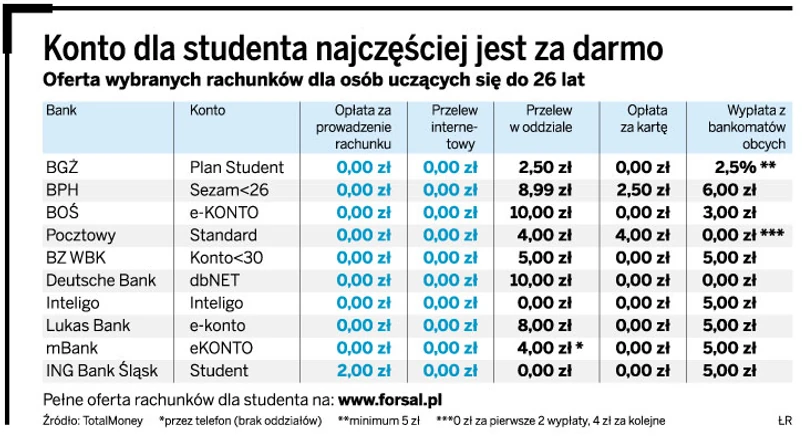Rachunki studenckie w większości instytucji są za darmo. Opłaty mogą się pojawić przy dokonywaniu przelewów w oddziale i wypłatach pieniędzy z obcych bankomatów.