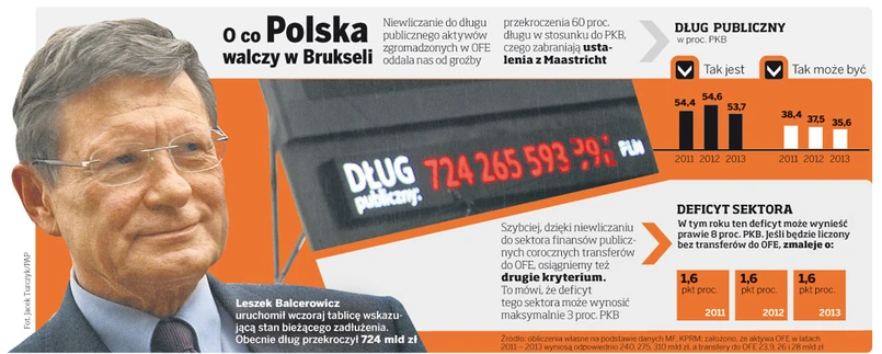 Coroczne odliczanie sum przekazywanych do OFE spowodowałoby, że deficyt sektora finansów publicznych byłby niższy od 1,5 do 2 proc. PKB, a dług – aż o blisko 15 proc. Rada Gospodarcza przy premierze stwierdziła, że bez tych zmian Polska praktycznie nie miałaby szans na spełnienie kryteriów z Maastricht: zejścia do 3-proc. deficytu sektora finansów publicznych i nieprzekroczenia 60 proc. długu w relacji do PKB. Przy zmianach zaproponowanych nam przez KE spełnimy te wymogi za dwa lata. Czyli w strefie euro znaleźlibyśmy się w 2015 r.