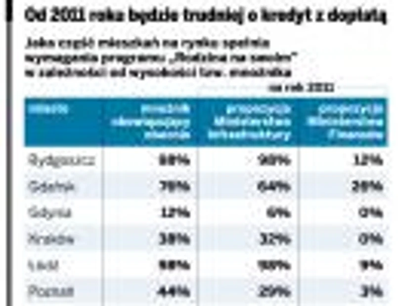Ministerstwo Infrastruktury chce bowiem, aby od przyszłego roku za kredyt z dopłatą można było kupować wyłącznie mieszkania na rynku pierwotnym. Proponuje także ograniczenie zapisanego w ustawie tzw. mnożnika z 1,4 do 1,3. Przy jego pomocy ustala się limit ceny metra nieruchomości finansowanej z kredytu.