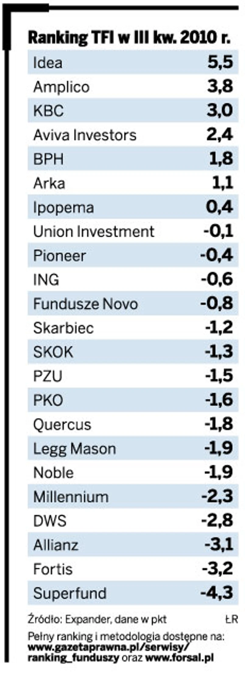Właśnie produkty specjalizujące się w inwestycjach zagranicznych pomogły Idei TFI w zajęciu pierwszego miejsca w kwartalnym rankingu Expandera i „DGP”. Idea Surowce Plus zarobił 13,4 proc., najwięcej z funduszy akcji zagranicznych sektorowych, a Idea Globalny z 10-proc. zyskiem był najlepszy wśród zagranicznych funduszy mieszanych rozliczanych w złotych.