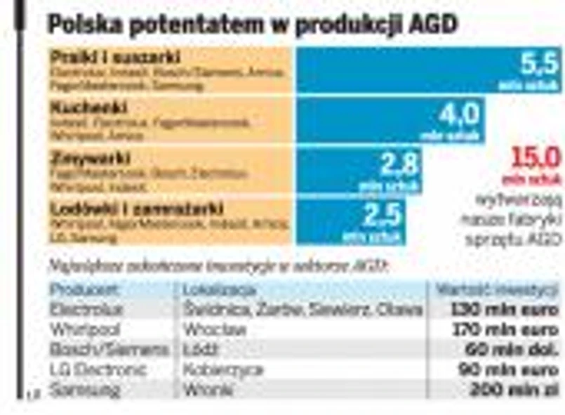Polska może sporo zyskać na ekspansji LG i Samsunga. Dzięki nim już w tym roku możemy zostać liderem w produkcji AGD w Europie, wyprzedzając Włochów. W naszym kraju wytwarza się teraz 15 mln sztuk urządzeń. To oznacza, że jeden pracownik produkuje ich 1 tys. rocznie.