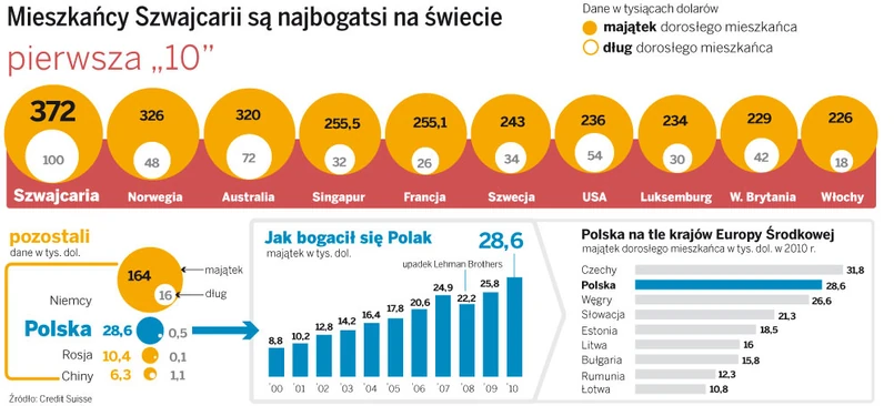 Poza dziesiątką najbardziej majętnych są Niemcy. Dorosły obywatel największej gospodarki UE i drugiego eksportera na świecie ma majątek wart 164 tys. dol. Europa Środkowa na tle czołówki wypada jeszcze bladziej. Najbogatsi są Czesi z 31,8 tys. dol., za nimi Polacy – 28,6 tys. dol.; dziesięć lat temu było to 8,8 tys. dol.