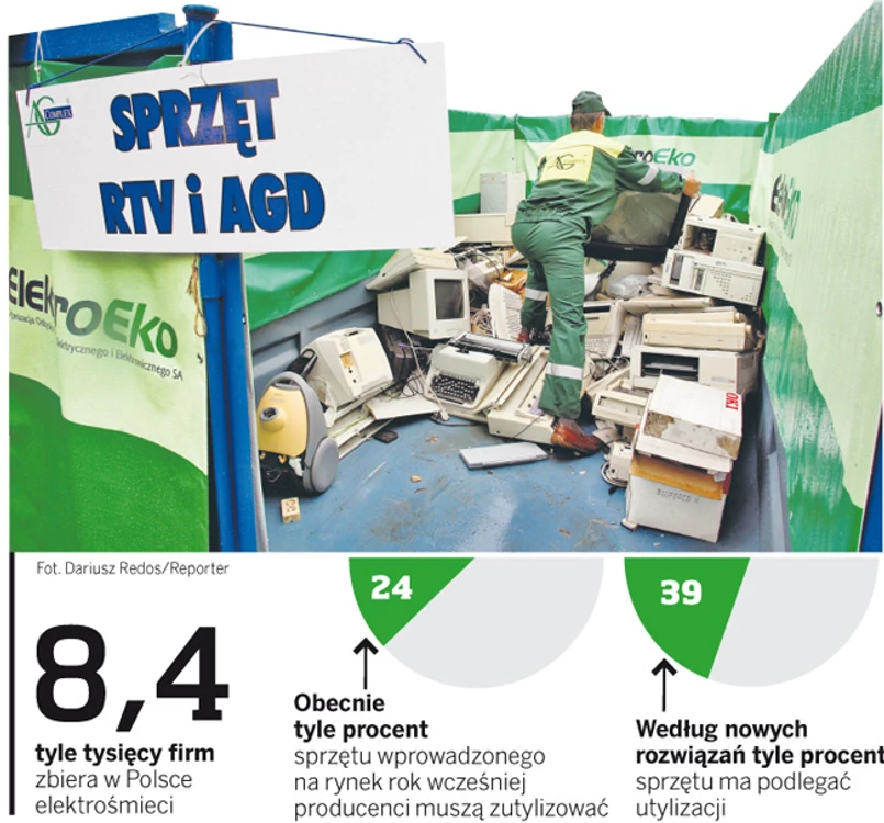 W resorcie środowiska trwają konsultacje w sprawie rozporządzenia o minimalnych rocznych poziomach zbierania zużytego sprzętu elektrycznego, np. lodówek, pralek, telewizorów czy komputerów. Obowiązujące do tej pory przepisy obligują producentów do zebrania 24 proc. sprzętu, który rok wcześniej wprowadzili na rynek. Teraz ministerstwo zamierza ten pułap podnieść do 39 proc. Chodzi o to, by zbliżyć się do unijnych wymogów, które obligują nas do zbierania rocznie ponad 4 kg elektrośmieci na mieszkańca. Polsce do tego poziomu daleko – w zeszłym roku udało się zebrać 2,7 kg na mieszkańca.