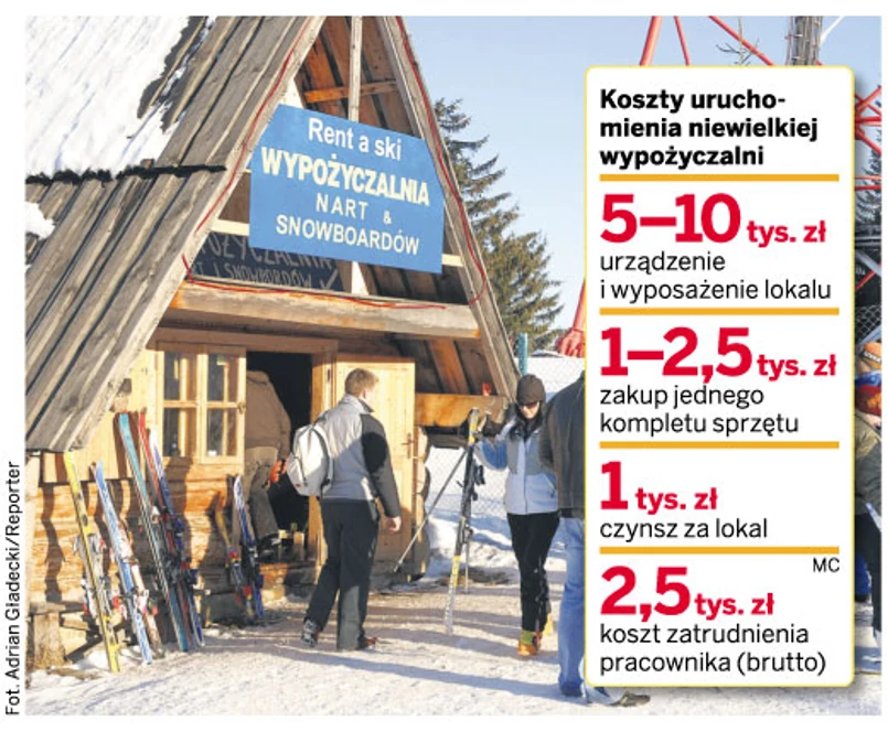 Na otwarcie niedużej wypożyczalni trzeba mieć przygotowane około 80 – 100 tys. zł. Tyle kosztuje przygotowanie lokalu oraz zakup sprzętu. Na początek wystarczy około 50 kompletów nart. Jak mówią właściciele istniejących wypożyczalni, przeważnie w ciągu dnia jest od 20 do 30 klientów.