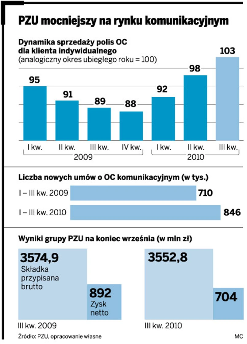 PZU odbudowuje swoją pozycję w segmencie polis komunikacyjnych dla klientów indywidualnych. Od pierwszego kwartału 2010 r. spółka sprzedaje coraz więcej polis AC. W trzecim kwartale dołączyły się do nich polisy OC. Ich sprzedaż na koniec września wzrosła (w porównaniu z ubiegłym rokiem) o 3 proc., a dynamika sprzedaży obu rodzajów polis – o 9 proc.