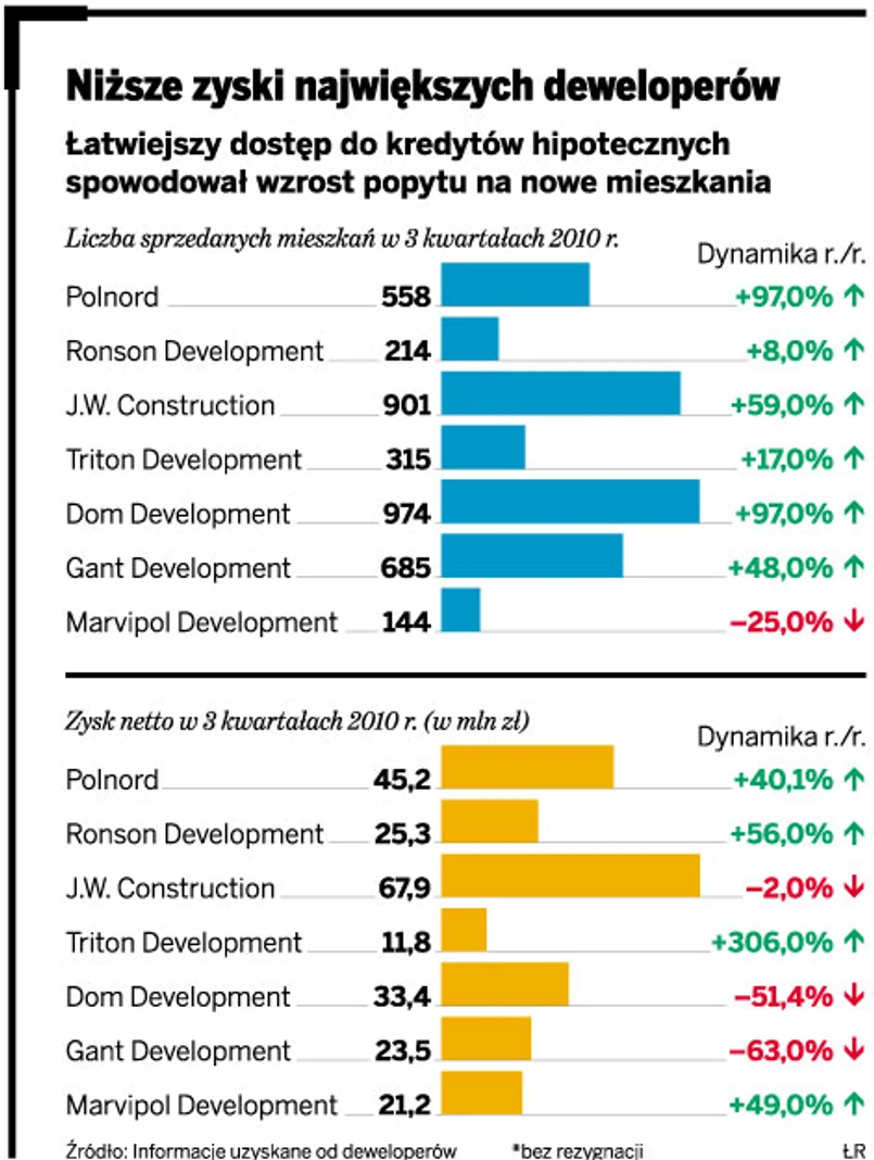 Prawdopodobnie z tego samego powodu mniejszy zysk niż przed rokiem ma też J.W. Construction. Inni deweloperzy nie mają tych problemów. Ronson, Polnord i Marvipol zarobiły o 40 – 60 proc. więcej niż rok temu. Rekordzistą jest Triton, który w pierwszych trzech kwartałach 2010 r. potroił zysk do analogicznego okresu roku ubiegłego – wyniósł on prawie 12 mln zł.
