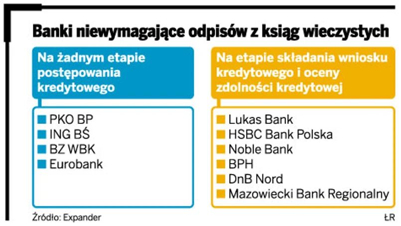 Z danych firmy Expander wynika, że w czterech bankach nie wymaga się od klientów dostarczenia odpisów z księgi na żadnym etapie postępowania kredytowego. Są to BZ WBK, Eurobank, ING Bank Śląski i PKO BP. Niestety nie oznacza to, że wszyscy klienci unikną kolejek w sądzie po odpis z KW. Papierowy dokument jest bowiem najczęściej wymagany przy wycenie nieruchomości.
