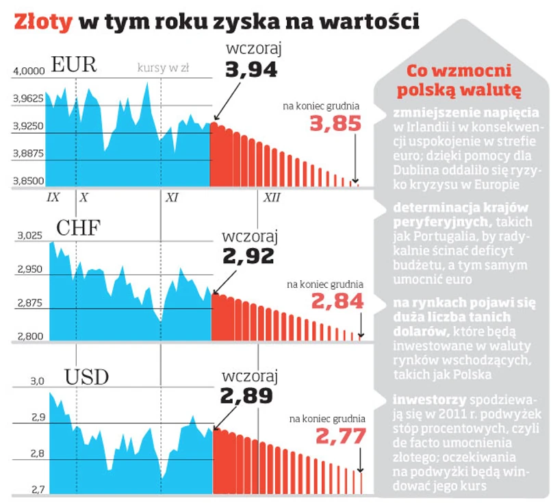 Złoty będzie rósł w siłę, jeśli sytuacja w strefie euro po ostatnim zamieszaniu wokół Irlandii się uspokoi. Rynek dobrze przyjął informację o pomocy dla tego kraju, ale neagtywnie zareagował na wieści o kłopotach z poparciem dla cięć w budżecie. Sytuacja nadal jest niepewna, analitycy czekają na informacje z innych krajów strefy euro. W tym tygodniu parlament Portugalii będzie głosował projekt budżetu na 2011 rok. Minister finansów Fernando Teixeira dos Santos zapewniał wczoraj, że Portugalia zrobi wszystko, by deficyt budżetu wyniósł 4,6 proc. PKB.