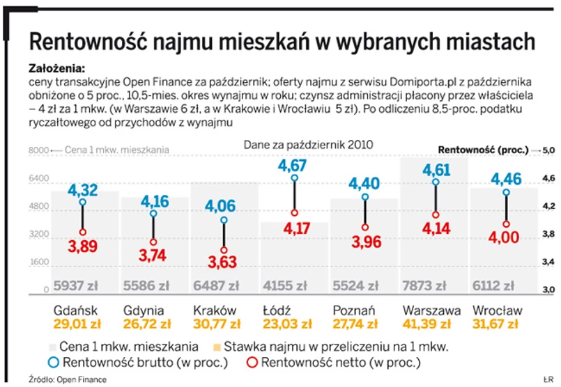 Uwzględniając ceny najmu według Home Broker, najlepiej zarobić można w Warszawie i we Wrocławiu, a według Open Finance w Łodzi i Warszawie. Najmniejszy z dużych miast zysk przynoszą nieruchomości w Gdyni, Gdańsku i Krakowie.