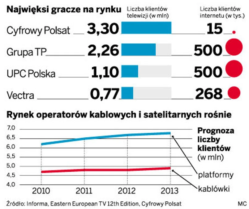 Dlatego Cyfrowy Polsat szykuje się do przedświątecznej walki o klientów z konkurencją: platformami Cyfra+ i n, a także z Grupą TP i operatorami kablowymi takimi jak UPC Polska, Vectra czy Aster. Wszyscy gracze realizują w okresie przedświątecznym co najmniej 25 proc. rocznej sprzedaży, dlatego właśnie wtedy oferują najwięcej promocji i nowości. Cyfra+ ruszyła po klientów m.in. z 50-proc. promocją na wybrane pakiety na 11 miesięcy. Platforma n wprowadziła z kolei do oferty usługę multiroom, czyli możliwość rozszczepienia sygnału z jednego dekodera na dwa telewizory. Swoje przedświąteczne nowości ogłosił też wczoraj Cyfrowy Polsat, który oferuje np. wybrany pakiet telewizyjny za darmo przez sześć miesięcy lub większe prędkości internetu.