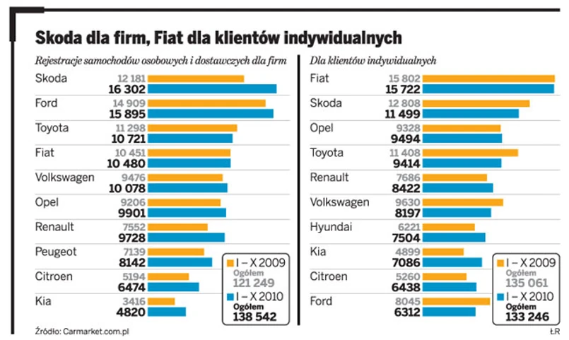 Kto w tym wyścigu zwycięży – Ford czy Skoda? Wygra ten, kto zaspokoi gigantyczne potrzeby firm, czyli de facto nie zabraknie mu samochodów, by zrealizować zamówienia. Tomasz Latała-Golisz z firmy analitycznej Carmarket.com.pl przypomina, że trwa okres prosperity. W październiku firmy zarejestrowały 16,7 tys. aut – o 2,8 tys. więcej niż rok temu. W efekcie w tym roku dilerzy już sprzedali ponad 17,3 tys. samochodów więcej niż rok temu.