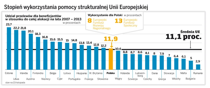 Z 67 mld euro w ramach funduszy strukturalnych, które przyznano Polsce na lata 2007 – 2013, do tej pory beneficjenci otrzymali zaledwie 8 mld (11,9 proc.). To minimalnie więcej, niż wynosi średnia europejska (11,1 proc.). Polska radzi sobie tylko nieco gorzej niż znacznie bardziej doświadczone w wykorzystaniu unijnej pomocy kraje starej Unii, jak Hiszpania (13,8 proc.), Portugalia (14,8 proc.) czy Niemcy (16,8 proc.).