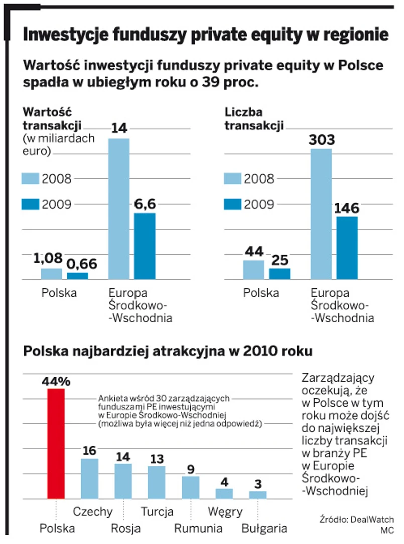 Z szacunków firmy analitycznej DealWatch, badającej rynek fuzji i przejęć, wynika, że na zakupy w Europie Środkowo-Wschodniej i Południowo-Wschodniej fundusze wydały w 2009 roku 6,6 mld euro, o ponad połowę mniej niż rok wcześniej. O ponad połowę spadła też liczba transakcji. W Polsce było nieco lepiej, bo transakcje spadły o 39 proc., a ich wartość wyniosła trochę ponad 661 mln euro.