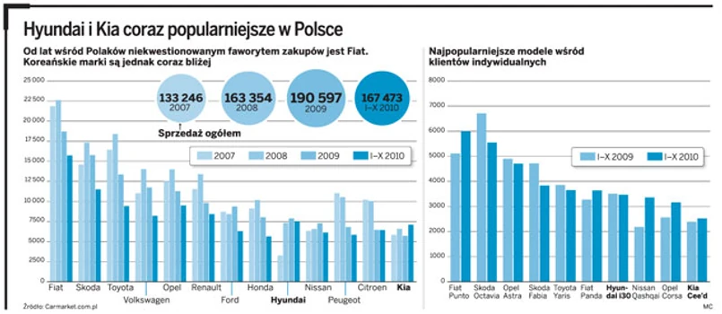 – Obie marki podążają tą samą drogą co Japończycy 20 lat temu. Mają szansę, by wskoczyć do pierwszej piątki rankingu sprzedaży – ocenia Andrzej Halarewicz, szef polskiego oddziału JATO Dynamics, firmy monitorującej rynek motoryzacyjny. Chwali on Kię i Hyundaia za to, że udało im się pogrzebać stereotyp, iż produkują awaryjne auta. Pomogły siedmioletnie gwarancje na kie i pięcioletnie na hyundaie.