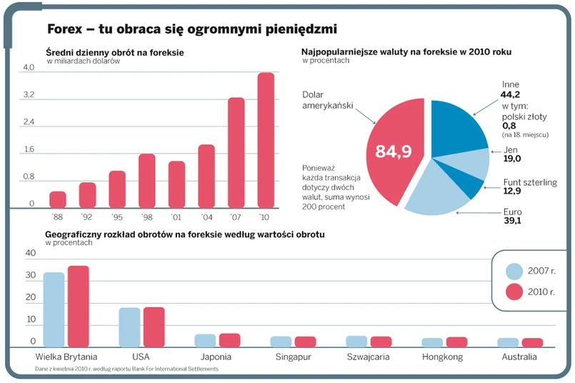 Na początek parę liczb w celu zobrazowania skali. W poniedziałek dzienny obrót akcjami na warszawskiej Giełdzie Papierów Wartościowych wyniósł 1,3 mld złotych, wraz z rynkiem kontraktów terminowych suma ta wzrosła do 3,7 mld. Ustanowiony w maju tego roku rekord dziennych obrotów na GPW to 6,6 mld złotych. Na największej na świecie giełdzie, New York Stock Exchange, średni dzienny obrót to ok. 170 mld dolarów. Na foreksie średni dzienny obrót wynosi 4 biliony dolarów, czyli 10 – 15 razy więcej niż na wszystkich giełdach świata razem wziętych. Cztery biliony dolarów to prawie dziesięciokrotność rocznego polskiego PKB. Na foreksie w ciągu dwóch tygodni dokonuje się transakcji o wartości równej rocznemu PKB całego świata. Na dodatek obroty zwiększają się w tempie szybszym niż wzrost gospodarczy.