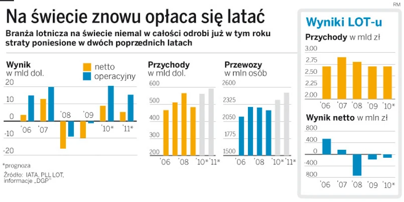 Analitycy światowego rynku lotniczego spodziewają się, że w tym roku zachodnie linie po dwóch latach strat znów wykażą zyski. A to dlatego, że w 2010 r. wzrósł ruch pasażerski (o 7,7 proc.) oraz towarowy (o 20 proc.). Wzrosła też sprzedaż w klasie biznes. Według ekspertów firmy Euler Hermes linie lotnicze odżyły, bo w trudnych latach zawczasu zredukowały koszty.