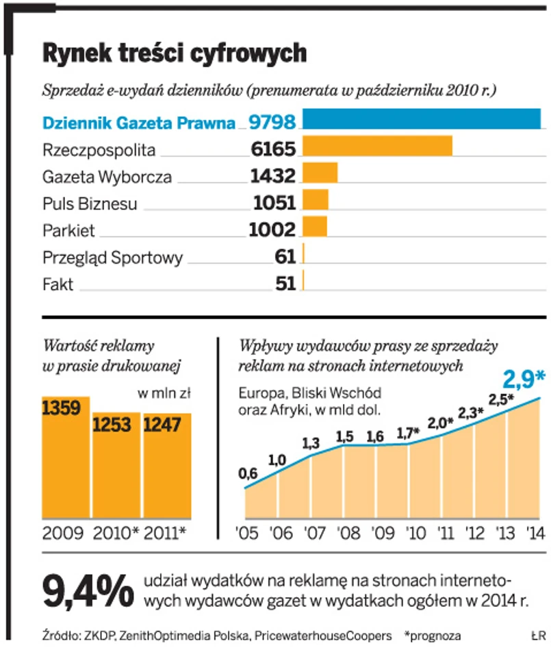 Działania kolejnych wydawców pokazują, że dobrze rozpoznali tę zależność: wprowadzają aplikacje, ale odpłatnie. „Newsweek Polska”, gdy ruszył na iPadzie, pozwolił czytelnikom ściągnąć za darmo tylko pierwszy numer; kolejne kosztują 0,79 euro. „Rzeczpospolita”, która wprowadziła niedawno własną aplikację, na razie udostępnia wydania za darmo, ale wydawca zapowiedział w branżowym „Pressie”, że od nowego roku część treści będzie płatna. Płatne są też dostępne za pośrednictwem aplikacji eGazety wydania innych dzienników, w tym „Dziennika Gazety Prawnej”.