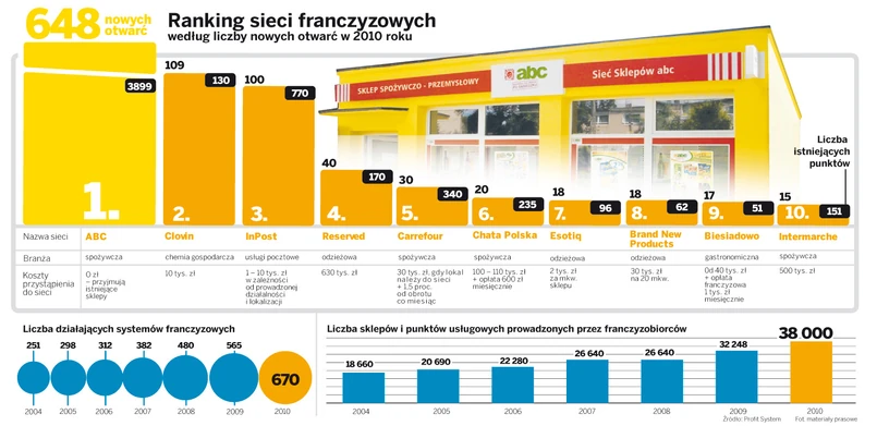 Wybór na rynku systemów franczyzowych jest coraz bogatszy– chętni mają do dyspozycji 670 sieci. Wśród stu nowych dominują zwłaszcza punkty usługowe, takie jak Bezwodna (myjnie samochodowe), Edukator (placówki edukacyjne dla dzieci i rodziców), Promstar (sprzedaż urządzeń w drodze aukcji). I wszystko wskazuje na to, że rynek nadal będzie się rozwijał w imponującym tempie.