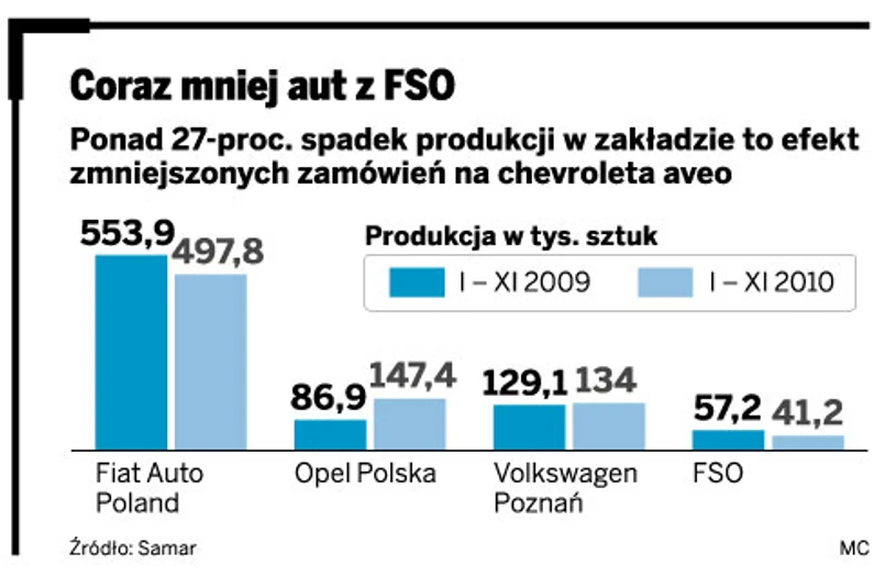 Do końca 2009 r. FSO za użytkowanie 110 ha terenów płaciła rocznie 1,9 mln zł. Od stycznia opłata wzrosła do 22 mln zł. Kwota nie byłaby zabójcza dla spółki, gdyby z taśm zjeżdżało tak jak kiedyś 150 – 200 tys. aut rocznie. Ale po spadku produkcji do 40 – 50 tys. sztuk jest to dla niej duży problem. A Mahindra & Mahindra na pewno nie będzie produkowała na Żeraniu więcej samochodów niż obecnie. Najprawdopodobniej trafi tu bowiem w przyszłości jeden z modeli znanej już na rynku europejskim koreańskiej marki Ssangyong Motor, która produkuje auta terenowe. Ssangyong jest właśnie przejmowane przez indyjską firmę.