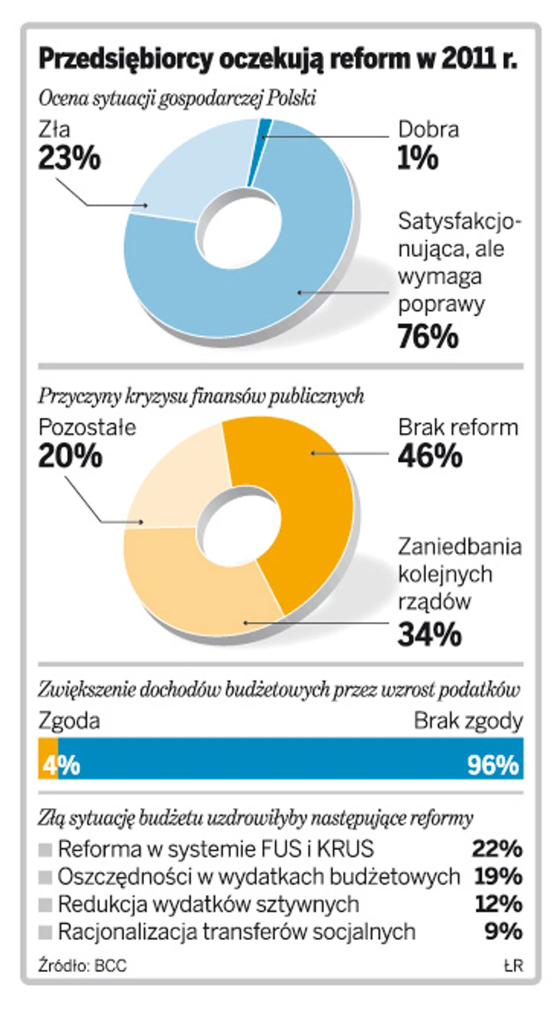 BCC zapytał przedsiębiorców o ich własne pomysły na reformę państwa. Chcieliby oni ograniczenia biurokracji, uproszczenia systemu podatkowego oraz likwidacji szarej strefy. Dodatkowo, gdyby władza trafiła w ich ręce, to Polska wycofałaby wojska z Afganistanu, doczekalibyśmy się wprowadzenia podatku liniowego, a część usług publicznych zostałaby sprywatyzowana.