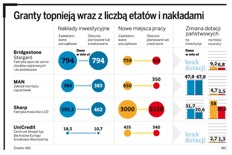 Granty do dużych inwestycji przyznawane są w ramach programów wieloletnich już od sześciu lat, ale dopiero w ubiegłym roku pojawiły się kłopoty z ich realizacją. Od grudnia 2009 r. 23 inwestorów, czyli połowa z ponad czterdziestu mających umowy z rządem, zaczęło zabiegać o zmiany zapisów: wydłużenie czasu na wywiązanie się z obietnic (od 1 do 3 lat), obniżenie wartości nakładów (średnio o 10 proc.) oraz liczby etatów (średnio o 30 proc.).