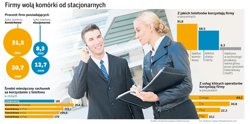 Jak wynika z badań dla UKE, w ciągu roku liczba firm, w których używa się tylko telefonów komórkowych, wzrosła o połowę. W 2009 roku wyłącznie z komórek korzystało 20,7 proc. przedsiębiorstw. Teraz jest ich już 31,5 proc. Równolegle spada liczba firm posiadających na stanie tylko aparaty stacjonarne – w ciągu ostatniego roku skurczyła się z 12,7 do 8,7 proc. Reszta firm korzysta zarówno z telefonii stacjonarnej, jak i komórkowej.