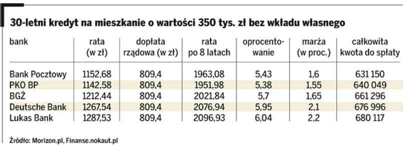 – W przypadku pierwszego banku w tabeli – Banku Pocztowego – rata miesięczna w okresie pierwszych 8 lat wynosi 1152,68 zł. Za ten sam kredyt w Pekao SA będziemy musieli płacić miesięcznie aż 1819,13 zł, czyli blisko 60 proc. więcej. Raty bez dopłat wynoszą w tych bankach odpowiednio 1963,08 zł i 2628,53 zł. – sumują autorzy opracowania.