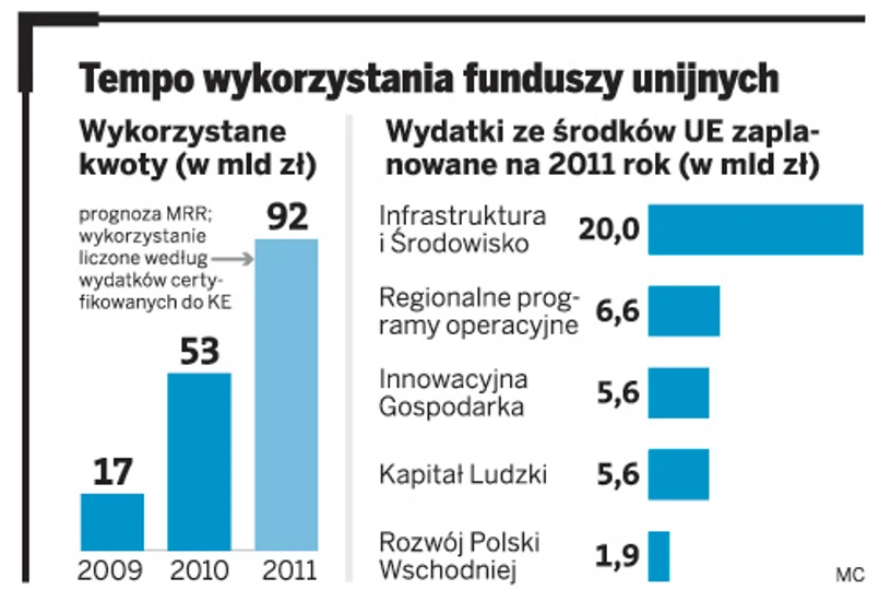 Z planów resortu rozwoju regionalnego wynika, że w tym roku Polska rozliczy z Brukselą 40 mld zł wypłaconych beneficjentom dotacji. Jednak minister ocenia, że ten plan – podobnie jak stało się w 2010 roku – uda się zrealizować z solidną górką. W ubiegłym roku plan MRR zakładał wykorzystanie 27 mld zł z UE. Tymczasem na koniec grudnia wartość przekazanych do Brukseli faktur wyniosła 35,7 mld zł.