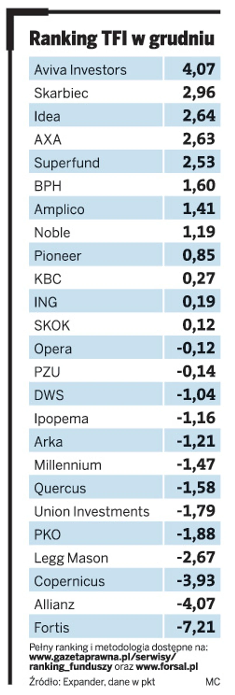 Jeżeli chodzi o grudniowy ranking TFI, najlepiej wypadło Aviva Investors, zdobywając w nim 4,07 pkt. Na drugim miejscu znalazł się Skarbiec TFI – 2,96 pkt, a dalej Idea – 2,64 pkt oraz Axa – 2,63 pkt. Na drugim końcu rankingu znalazło się Fortis TFI z wynikiem 7,21 pkt na minusie. Nieco lepiej wypadły Allianz – minus 4,07 pkt – oraz Copernicus – minus 3,93 pkt.