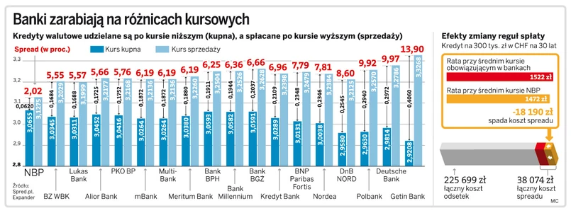 Obecnie różnica między kursem, po jakim kredyty walutowe są udzielane, a po jakim spłacają je kredytobiorcy (spread) sięgać może niemal 14 proc. (w Getin Banku). W bankach, które klientów walutowych traktują najlepiej, spread wynosi mniej niż 6 proc. (BZ WBK, Lukas Bank, Alior Bank i PKO BP).