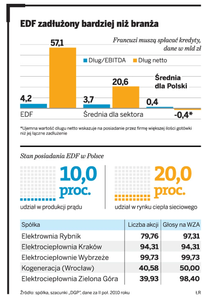 Wskaźniki zadłużenia EDF są znacznie wyższe od średniej w sektorze i nieporównywalnie wyższe od obecnych poziomów w polskiej energetyce. Według wyliczeń Bloomberga, który porównał dane dla 16 największych europejskich firm z sektora elektroenergetycznego, w przypadku Francuzów zadłużenie liczone wskaźnikiem długu do EBITDA wynosi aż 4,2 przy średniej dla branży 3,7.