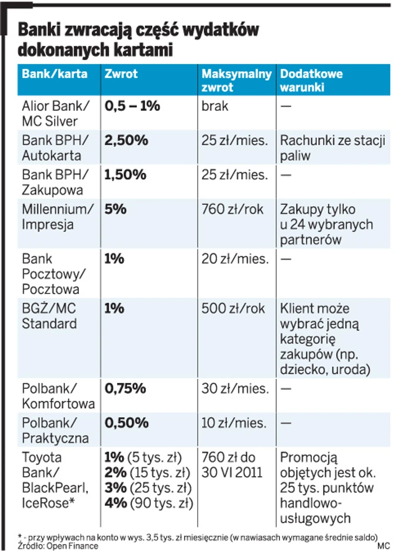 Coraz więcej banków daje klientom możliwość korzystania z usługi moneyback, czyli zwracania na konto części pieniędzy za rachunki opłacone kartą. W grudniu 2010 roku dołączył do nich Bank Pocztowy, a od początku tego roku swoją ofertę uatrakcyjnił Toyota Bank, podnosząc maksymalną wysokość zwrotu z 3 do 4 proc. wartości transakcji.