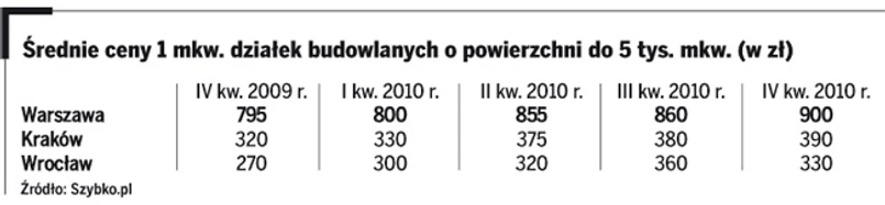 Z kolei w zestawieniu działek do 5 tys. mkw. przygotowanym przez Szybko.pl za 1 mkw. działki budowlanej w stolicy na koniec IV kwartału oczekiwano średnio 900 zł, czyli 105 zł więcej niż rok temu. Ceny ofertowe z IV kwartału 2010 są w przypadku Warszawy zbliżone do poziomu z 2008 roku.