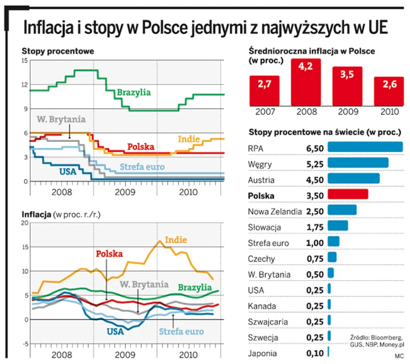 Ekonomiści przewidują jednak, że do góry mogą pójść najwcześniej pod koniec 2011 roku. Na razie wśród europejskich decydentów wciąż dominuje przekonanie, że wyższe stopy mogłyby zniechęcić rynki do skupowania obligacji. A to za pieniądze z ich emisji Grecy, Irlandczycy czy Hiszpanie walczą z widmem bankructwa. Wzrost stóp mógłby pogłębić kryzys zadłużeniowy w strefie euro. Podobnej polityce hołduje na razie również brytyjski Bank of England. Stopy na wyspach od 22 miesięcy pozostają na poziomie 0,5 proc. Londyn doskonale zdaje sobie sprawę, że podwyżka stóp mogłaby doprowadzić do podcięcia powracającej z wolna koniunktury i to dlatego na razie zdaje się nie martwić zbytnio 3,3-proc. inflacją.