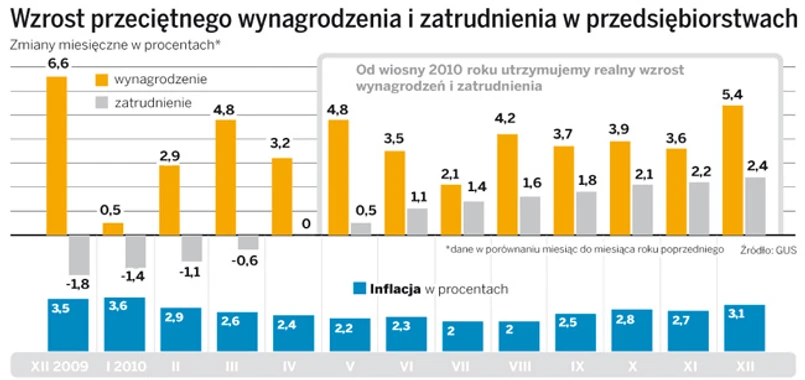 Tak jak decyzja Rady Polityki Pieniężnej o podniesieniu stóp procentowych o 0,25 pkt proc. nie była żadną niespodzianką, tak dane GUS dotyczące zarobków zaskoczyły. Bardzo pozytywnie, zwłaszcza gdy porównamy grudzień 2010 i 2009 roku. Zatrudnienie w sektorze przedsiębiorstw zwiększyło się zgodnie z oczekiwaniami o 2,4 proc. – do 5,379 mln osób. Wzrost na podobnym poziomie utrzymuje się od października ubiegłego roku.