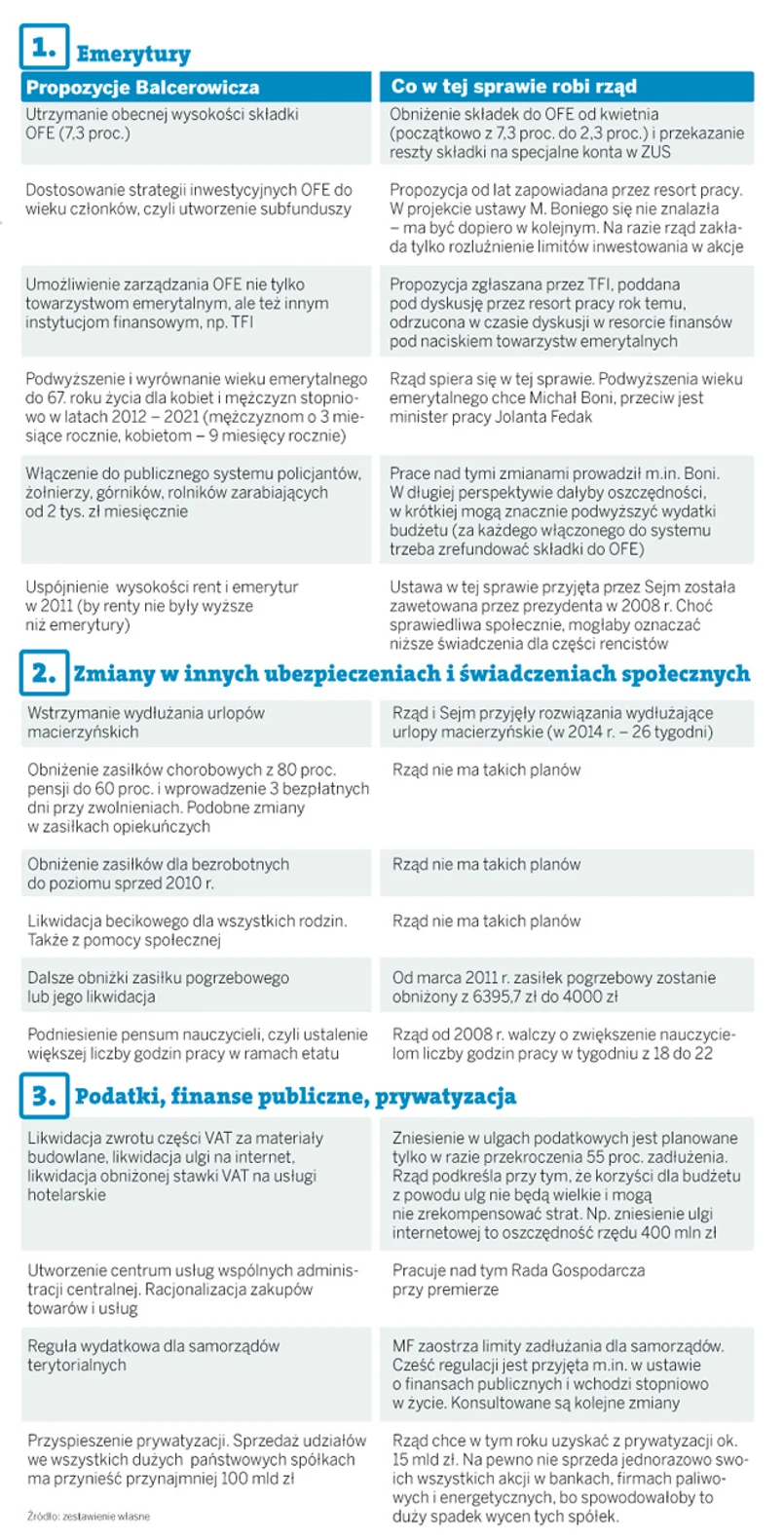 Balcerowicz proponuje drastyczne cięcia wydatków socjalnych, zwłaszcza prorodzinnych, rezygnację z ulg w PIT np. na internet czy zwrotu części VAT na materiały budowlane, podwyższenie wieku emerytalnego.
