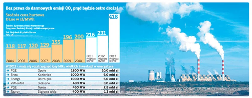 Dziś na hurtowym rynku energii za 1 MWh płaci się ok. 200 zł. Jak szacuje Społeczna Rada Narodowego Programu Redukcji Emisji, która doradza ministrowi gospodarki, w ciągu dwóch lat cena może podskoczyć nawet do 418 zł.