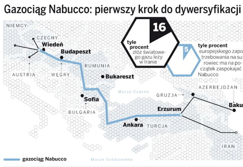 Jednym z najważniejszych punktów w staraniach o zmniejszenie zależności od dostaw z Rosji jest zakontraktowanie do budowanego gazociągu Nabucco surowca z Turkmenistanu i Azerbejdżanu. Obie stolice, umiejętnie lawirujące między Rosją a Zachodem, stały się w ostatnich dniach obiektem zabiegów europejskiej i rosyjskiej dyplomacji. W połowie stycznia w Baku i Aszchabadzie gościli szef Komisji Europejskiej Jose Manuel Barroso i komisarz ds. energii Guenther Oettinger, którzy spotkali się z prezydentami obu państw Ilhamem Alijewem i Gurbanguły Berdymuchamedowem. Udział Azerów w korytarzu południowym jest już w zasadzie przesądzony. Nie jest jednak powiedziane, że będzie to konkretnie Nabucco. Baku może – zgodnie z własnymi interesami – wybrać np. projekt White Stream planowany po dnie Morza Czarnego między Gruzją a Rumunią. Decyzja co do długoterminowej strategii eksportu energii przez Azerbejdżan ma zostać podjęta jeszcze w tym roku.