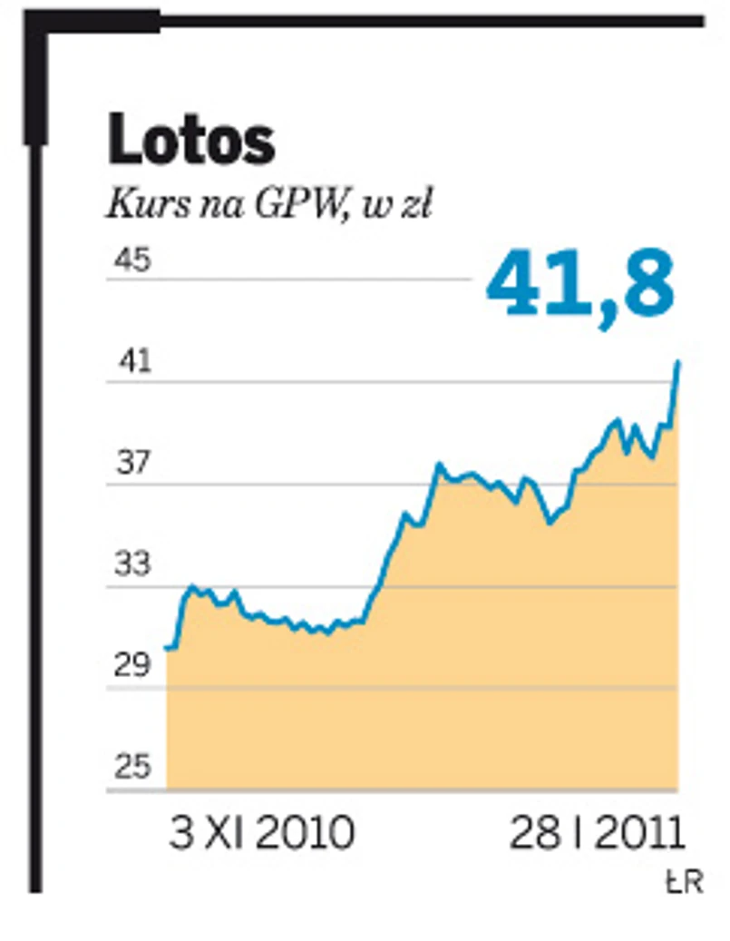 Informacja taka nie mogła pozostać bez echa na warszawskim parkiecie. Walory koncernu szybko zaczęły piąć się w górę i w końcu okazały się liderem wzrostów wśród spółek wchodzących w skład indeksu WIG20. Na zakończeniu piątkowej sesji za jedną akcję Lotosu trzeba było zapłacić 41,80 zł. To skok o ponad 6 proc. w porównaniu z czwartkowym zamknięciem, a do tego roczne maksimum walorów spółki. Dla porównania akcje największego konkurenta Lotosu na polskim rynku – PKN Orlen – podrożały w piątek o niecały 1 proc. Indeks WIG spadł o ponad 0,6 proc.