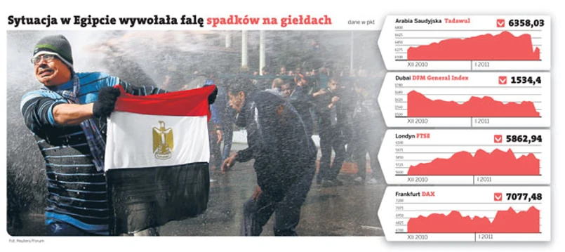 Drugim problemem jest odpływ kapitału i ucieczka inwestorów. Egipt ma wprawdzie wystarczające rezerwy walutowe i nie musi się zadłużać, ale jeśli protesty będą trwały tygodnie czy miesiące, zaczną one niebezpiecznie topnieć. Szczególnie że trwa odpływ kapitału za granicę. Według nieoficjalnych szacunków w zeszłym tygodniu na zagraniczne konta transferowane było co najmniej 500 milionów dolarów dziennie. Jeśli takie tempo się utrzyma, w ciągu miesiąca Egipt straci jedną czwartą swoich rezerw walutowych. Niespokojna sytuacja przekłada się też na działalność zagranicznych firm. Wczoraj o czasowym zamknięciu swoich zakładów poinformował japoński Nissan, a PGNiG o powrocie pracowników do Polski. Z powodu ograniczenia wyjazdów mocno traciły akcje firm turystycznych i towarzystw lotniczych. Dobrą informacją dla światowej gospodarki jest natomiast to, że ruch przez Kanał Sueski odbywa się bez zakłóceń, choć i tak ceny ropy utrzymują się w okolicach 99 dolarów za baryłkę.
