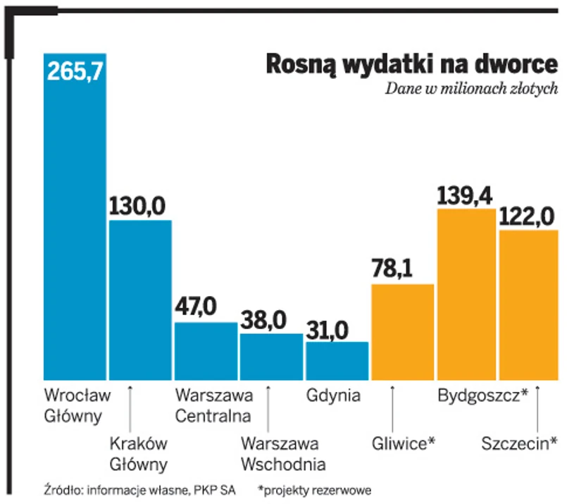 Do 2012 r. za ok. 980 mln zł wygląd ma zmienić 77 dworców. Jak dowiaduje się „DGP”, modernizacji przy współudziale środków budżetowych może być więcej, bo kolejarze wystarali się w Ministerstwie Rozwoju Regionalnego o unijne pieniądze na kolejne trzy duże remonty. Chodzi o inwestycje w Gliwicach o wartości 78,08 mln zł, Bydgoszczy – 139,43 mln zł oraz w Szczecinie – 122 mln zł. PKP chcą jeszcze za 28,12 mln zł poprawić bezpieczeństwo na warszawskich dworcach dzięki połączeniu systemów monitoringu w jeden.