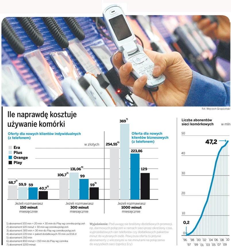 Gdy dzwonimy do różnych osób i w dodatku mających telefony w różnych sieciach, musimy obliczyć, który z operatorów daje nam najwięcej darmowych minut w abonamencie i w najbardziej przystępnej cenie. Trzeba też sprawdzić, ile zapłacimy za każdą dodatkową minutę po przekroczeniu limitu. Np. dla abonamentów za 50 – 60 zł w przypadku Plusa będzie to 48 groszy, a w Play – 29 groszy.
