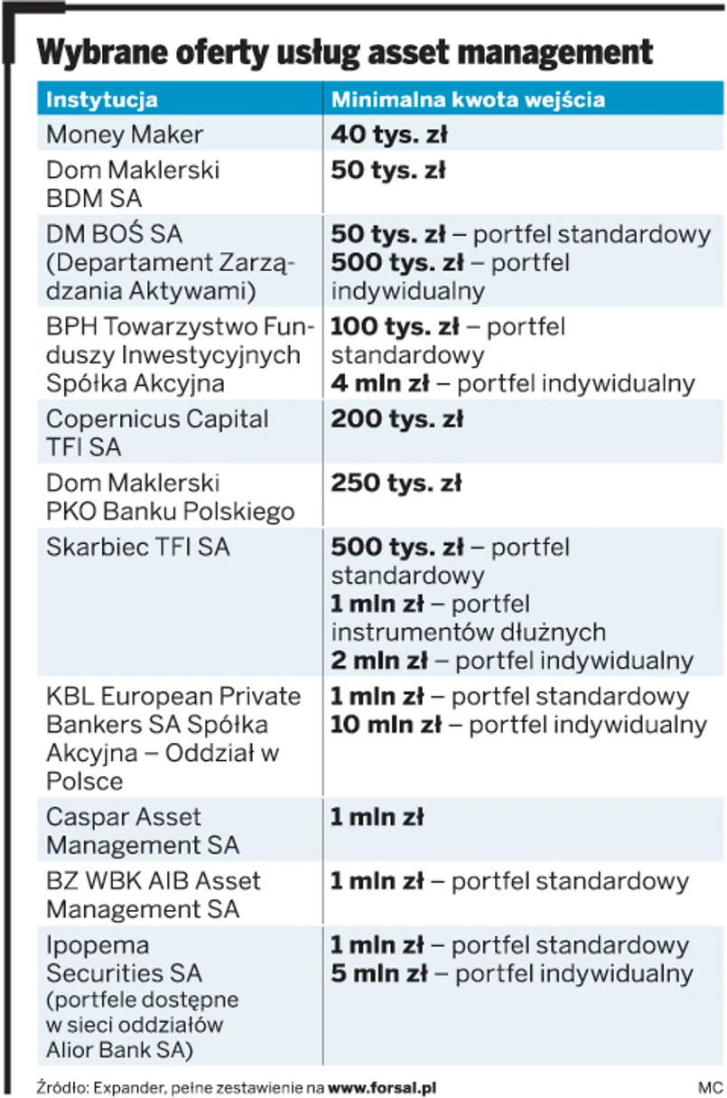 W Skarbiec TFI indywidualny portfel inwestycyjny może mieć klient dysponujący 2 mln zł, w BPH TFI – 4 mln zł, w Ipopema Securities – 5 mln zł, a w KBL European Private Bankers – co najmniej 10 mln zł. Pozostali klienci asset management mają do wyboru kilka modeli inwestycyjnych.