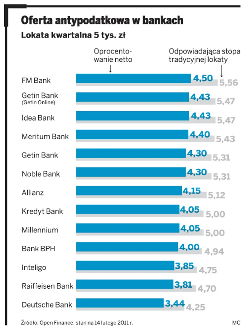W ostatnich miesiącach ich popularność rosła szybciej niż innych form oszczędzania. Resort finansów szacuje, że udział lokat antypodatkowych, na które moda nastała w 2010 r., w depozytach gospodarstw domowych wynosi już 13 proc. To kwota rzędu 55 mld zł. Popularność ta jest w pełni zasłużona. Gdy średnie oprocentowanie tradycyjnych lokat nie przekracza 3,5 – 4 proc., to rekordziści, jak np. FM Bank, Allianz czy Getin Bank, oferują antybelkowe lokaty pozwalające zarobić nawet ok. 5,5 proc. w skali roku.
