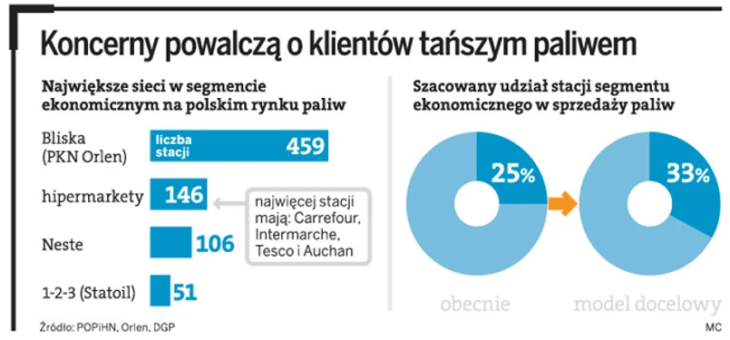 Detaliczny handel paliwami w Polsce jest już niemal podzielony. Zdominowało go pięć sieci – Orlen, Lotos, BP, Statoil i Shell. Razem mają w nim 50-proc. udział. Wszystkie działają jednak w tzw. segmencie premium, co oznacza, że ich stacje mają bogatą ofertę produktów i usług wysokiej jakości, ale też za odpowiednio wysoką cenę.