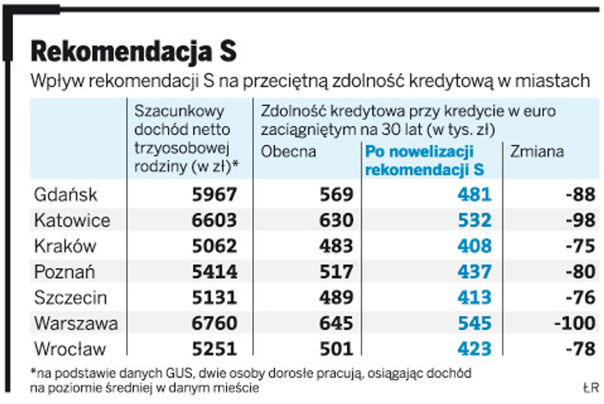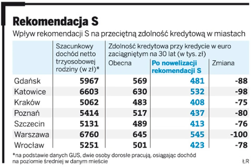 Nowelizacja rekomendacji S, która wejdzie w życie na początku przyszłego roku, najbardziej dotknie kredytobiorców w Katowicach, Szczecinie i Gdańsku. Rodziny, które zarabiają tam więcej, niż wynosi średnia krajowa, dostaną nawet o 80 – 100 tys. zł mniejszy kredyt we franku szwajcarskim czy euro – wyliczył Home Broker. Oznacza to, że stać ich będzie na mieszkanie o 15 – 20 metrów mniejsze, niż planowali.