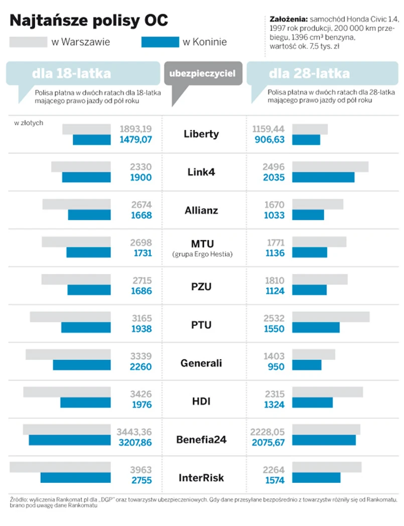 Między samymi towarzystwami zróżnicowanie cen jest wyjątkowo duże i sięga nawet 150 proc. Jeśli założymy, że polisy dla Hondy Civic 1,4 z 1997 r. szuka 18-latek, który właśnie zrobił