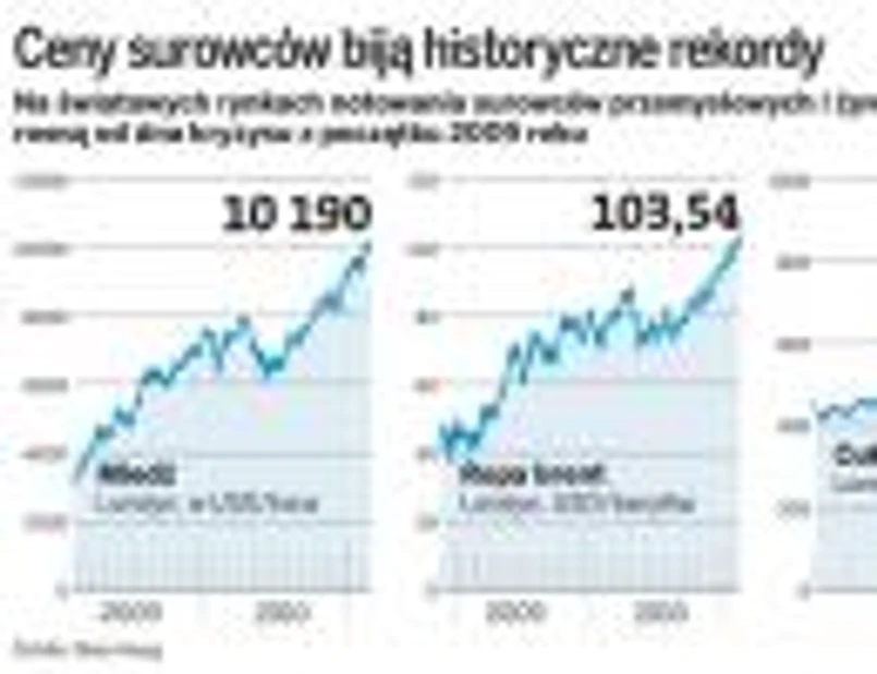 Notowania surowców przemysłowych na światowych rynkach biją rekordy cenowe. Ropa naftowa na giełdzie w Londynie kosztuje obecnie ok. 105 dol. za baryłkę, co oznacza, że w ciągu ostatnich 12 miesięcy podrożała o 42 proc. Z kolei miedź skoczyła w ciągu ostatniego roku o 48 proc., do ponad 10 tys. dol. za tonę. Historyczne rekordy cenowe pobiło ostatnio złoto, które kosztowało już ponad 1400 dol. za uncję. Ale jego cena już spadła do ok. 1370 dol. Czy to znak, że hossa na złocie już się skończyła? Zdaniem niektórych analityków tak właśnie jest, a spadek cen będzie dotyczył nie tylko złota, lecz także innych surowców, między innymi ropy i miedzi. Zdaniem Michała Marczaka, szefa działu analiz DI BRE Banku, wchodzimy w okres wysokiego wzrostu gospodarczego, któremu towarzyszyć może spadek cen surowców.