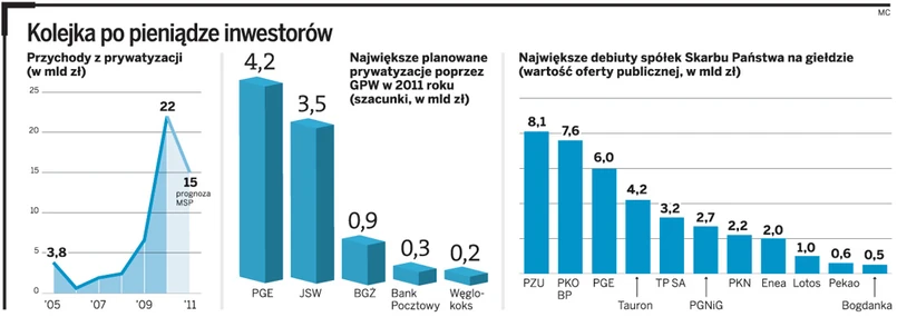 Resort skarbu chce sprzedać kilka państwowych tuzów za pośrednictwem GPW. Tak ma się stać z BGŻ, którego wartość oferty ma wynieść prawie miliard złotych, Jastrzębską Spółką Węglową – aż 3,5 mld zł, Holdingiem Nieruchomościowym i Bankiem Pocztowym – oba są warte po kilkaset milionów złotych. Aby zrealizować plan prywatyzacyjny, MSP rozpocznie wyprzedaż części posiadanych przez siebie akcji PZU i PKO BP. Wartość walorów tych firm znajdujących się jeszcze w rękach resortu to kilkadziesiąt miliardów złotych. Minister skarbu zapowiedział, że chce pozostawić w swoich rękach niewiele ponad 25 proc. akcji obu tych spółek. Część akcji może trafić na rynek jeszcze w tym roku. Podobnie jak pakiety Tauronu i PGE.